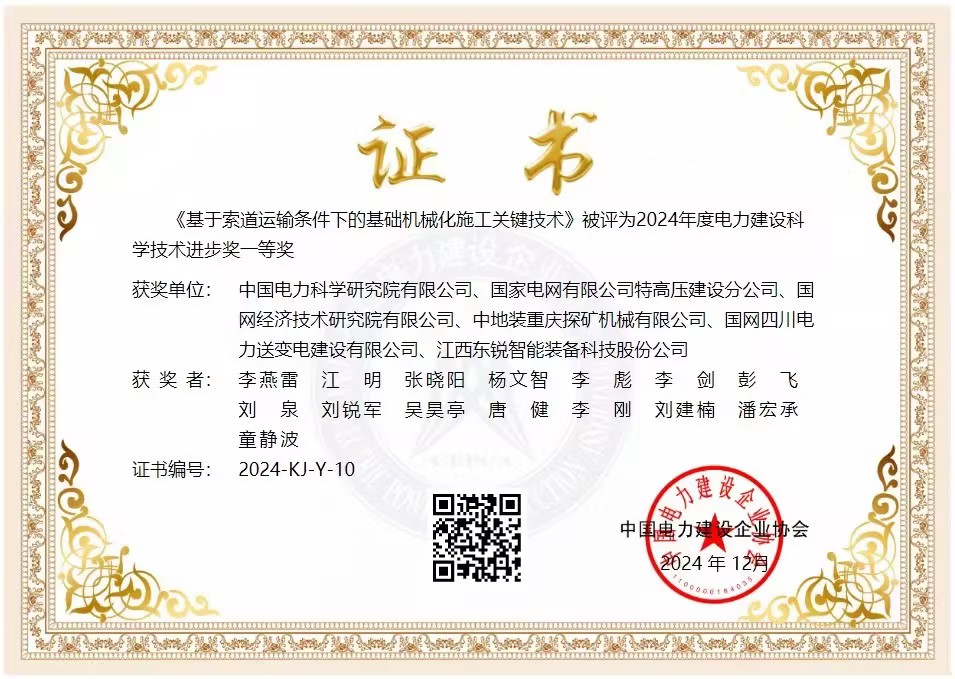 《基于索道運輸條件下的基礎(chǔ)機械化施工關(guān)鍵技術(shù)》被評為2024年度電力建設(shè)科學(xué)技術(shù)進(jìn)步獎一等獎。
